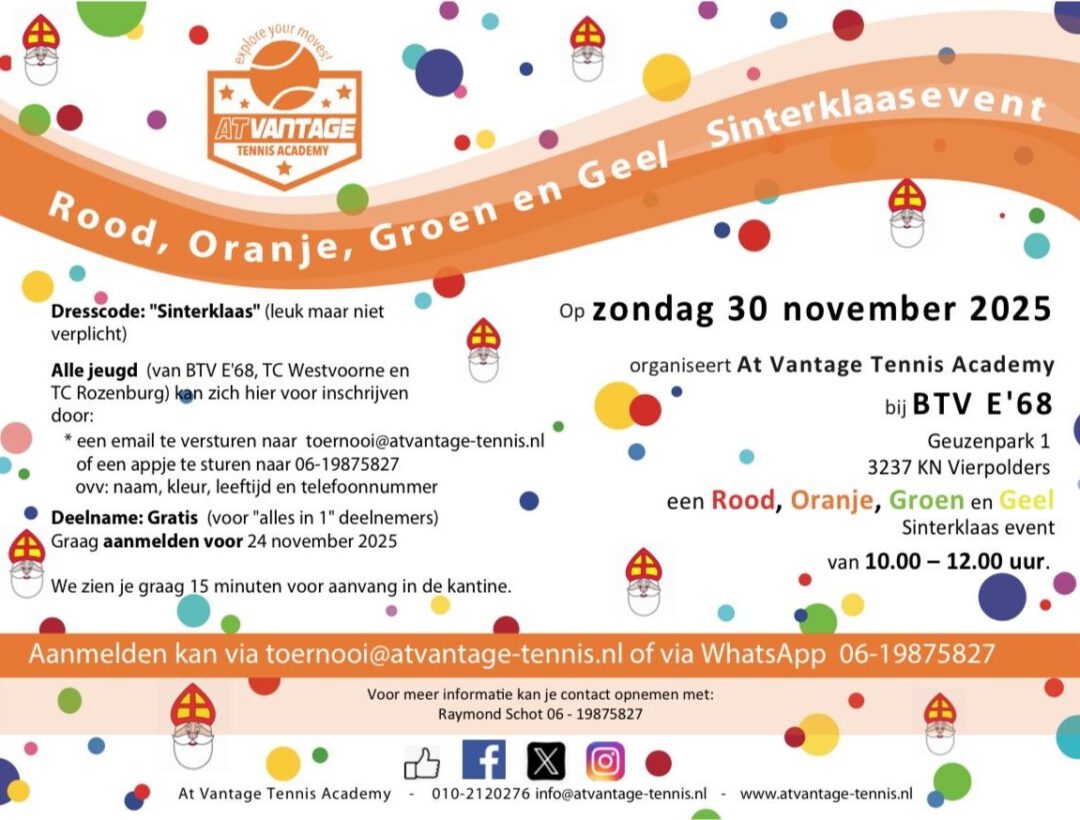 Op zondag 30 november a.s. organiseren wij samen met de jeugdcommissies van BTV E’68, TC Westvoorne en TC Rozenburg van 10.00 tot 12.00 uur een Sinterklaas event voor de jeugd bij BTV E’68 in Brielle.